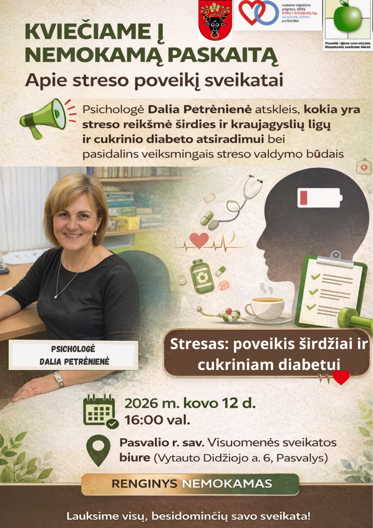 Ar žinojote, kad nuolatinis stresas gali turėti didelę įtaką širdies ir kraujagyslių ligų bei cukrinio diabeto atsiradimui? Kviečiame dalyvauti paskaitoje, kurios metu psichologė Dalia Petrėnienė paaiškins, kokią reikšmę stresas turi mūsų fizinei sveikatai, ir pasidalins praktiškais bei efektyviais streso valdymo…