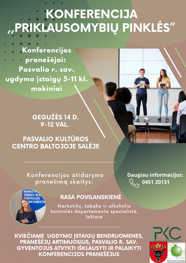 Gegužės 14 d. 9.00–12.00 val. Pasvalio kultūros centro Baltoji salė Renginio metu 5–11 klasių Pasvalio rajono mokiniai pristatys savo pranešimus apie priklausomybes, dalinsis įžvalgomis ir patirtimis. Konferenciją atidarys ir pranešimą skaitys Rasa Povilanskienė – Narkotikų, tabako ir alkoholio kontrolės departamento…
