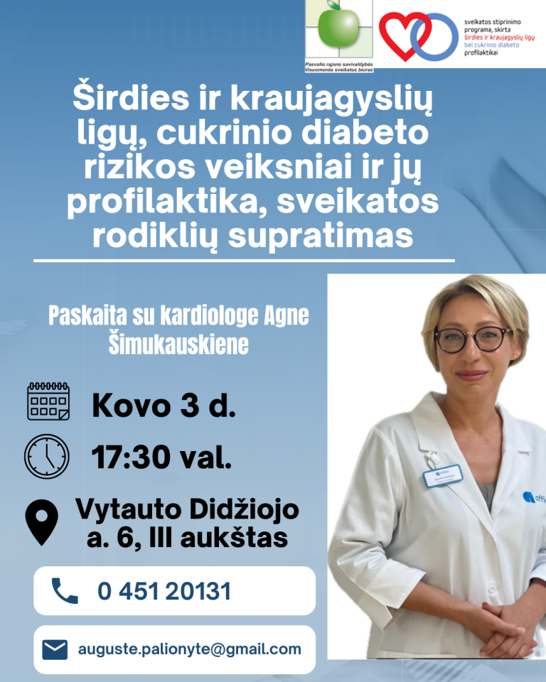 Ar žinojote, kad maži pokyčiai kasdienybėje gali užkirsti kelią rimtoms ligoms? Pasvalio r. sav. visuomenės sveikatos biuras kviečia dalyvauti Širdies ir kraujagyslių ligų bei cukrinio diabeto rizikos grupių asmenų sveikatos stiprinimo programoje. Dalinamės vasario–kovo mėnesių užsiėmimų grafiku!  Kas jūsų laukia?…