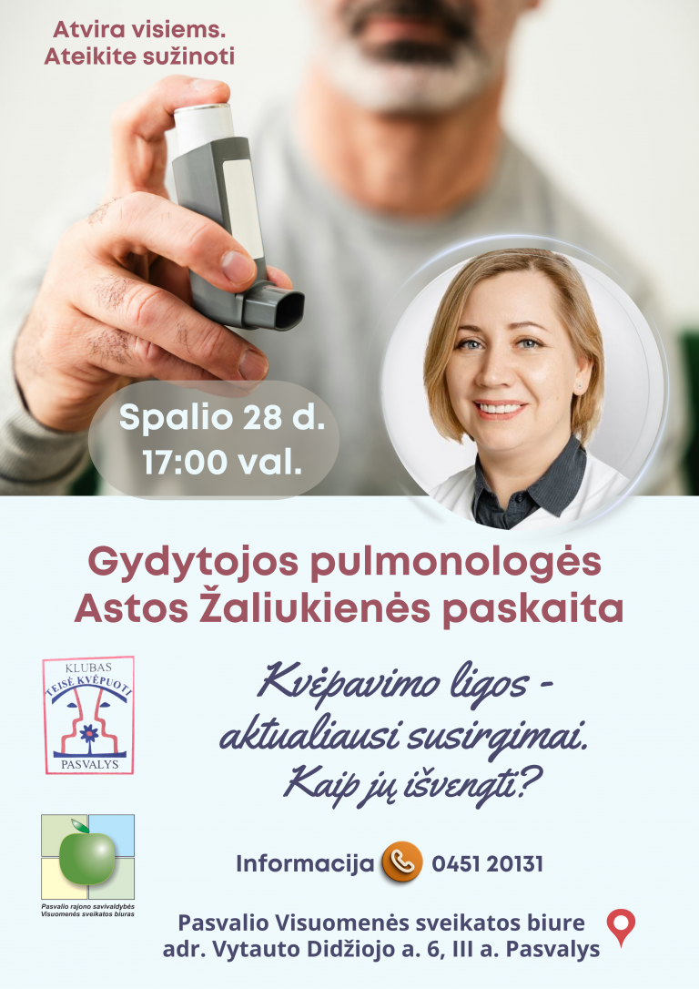 Spalio 28 d. (antradienį) 17:00 val. gyd. pulmonologė Asta Žaliukienė lankysis Pasvalyje, Visuomenės sveikatos biure (adr. Vytauto Didžiojo a. 6, III aukštas), ir kalbės apie kvėpavimo ligų aktualiausius susirgimus ir kaip jų išvengti. Maloniai kviečiame visus besidominčius. Sužinosite: inhaliatoriai –…