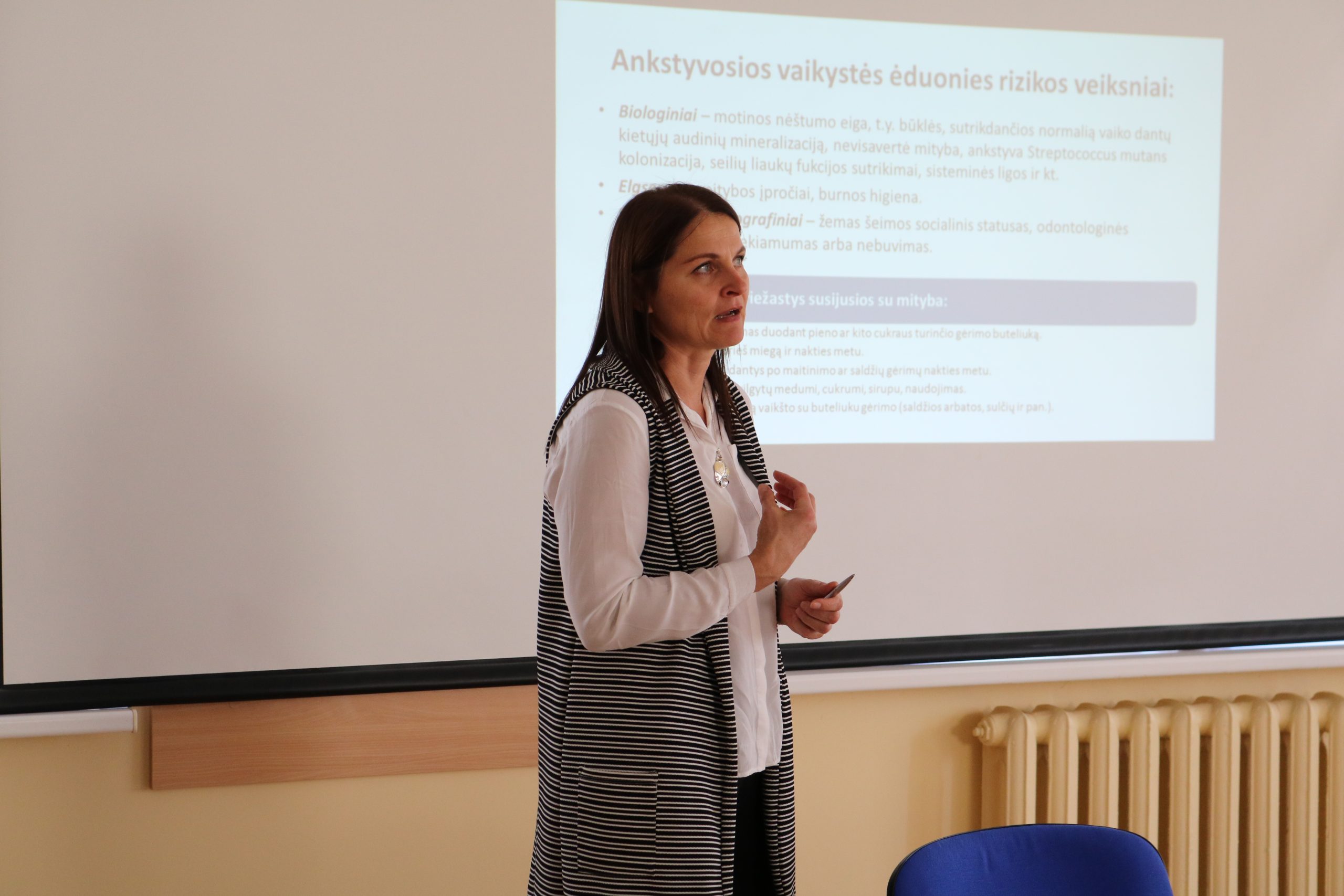 Lektorė Rima Adomaitienė papasakojo apie burnos sveikatos svarbą, burnos ir dantų anatomiją, dantų vystymąsi ir dygimą, dantų ir dantenų ligas bei sąkandį.