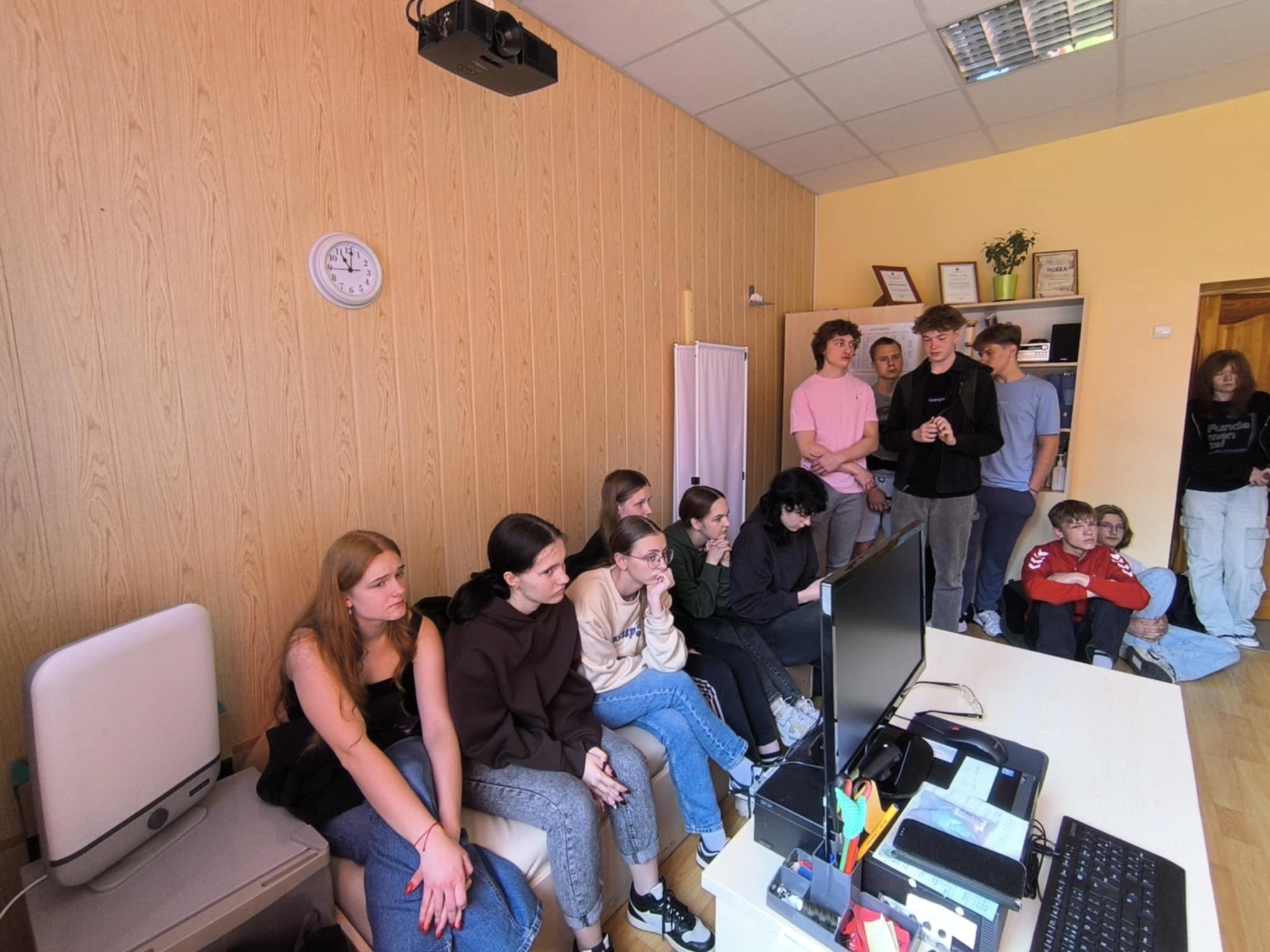 Gimnazistai apsilankė ir gimnazijos sveikatos kabinete, kur tęsė pažintį su regėjimo sutrikimų tema. Visuomenės sveikatos specialistė, vykdanti sveikatos priežiūrą mokykloje, R. Rutkauskienė, diskutavo su mokiniais apie dažniausius mokinių tarpe pasitaikančius regėjimo sutrikimus, jų korekcijos būdus. Panagrinėjo šių sutrikimų atsiradimo priežastis, paaiškino, kiek dažnai reikia tikrintis regą. Kalbėta apie tai, kaip maistas, kompiuteriai, telefonai įtakoja regėjimo kokybę. Norintys galėjo pasitikrinti regėjimo aštrumą Sneleno diagrama. Kad gyvenimo spalvos būtų ryškios, saugokime savo akis ir jomis rūpinkimės.