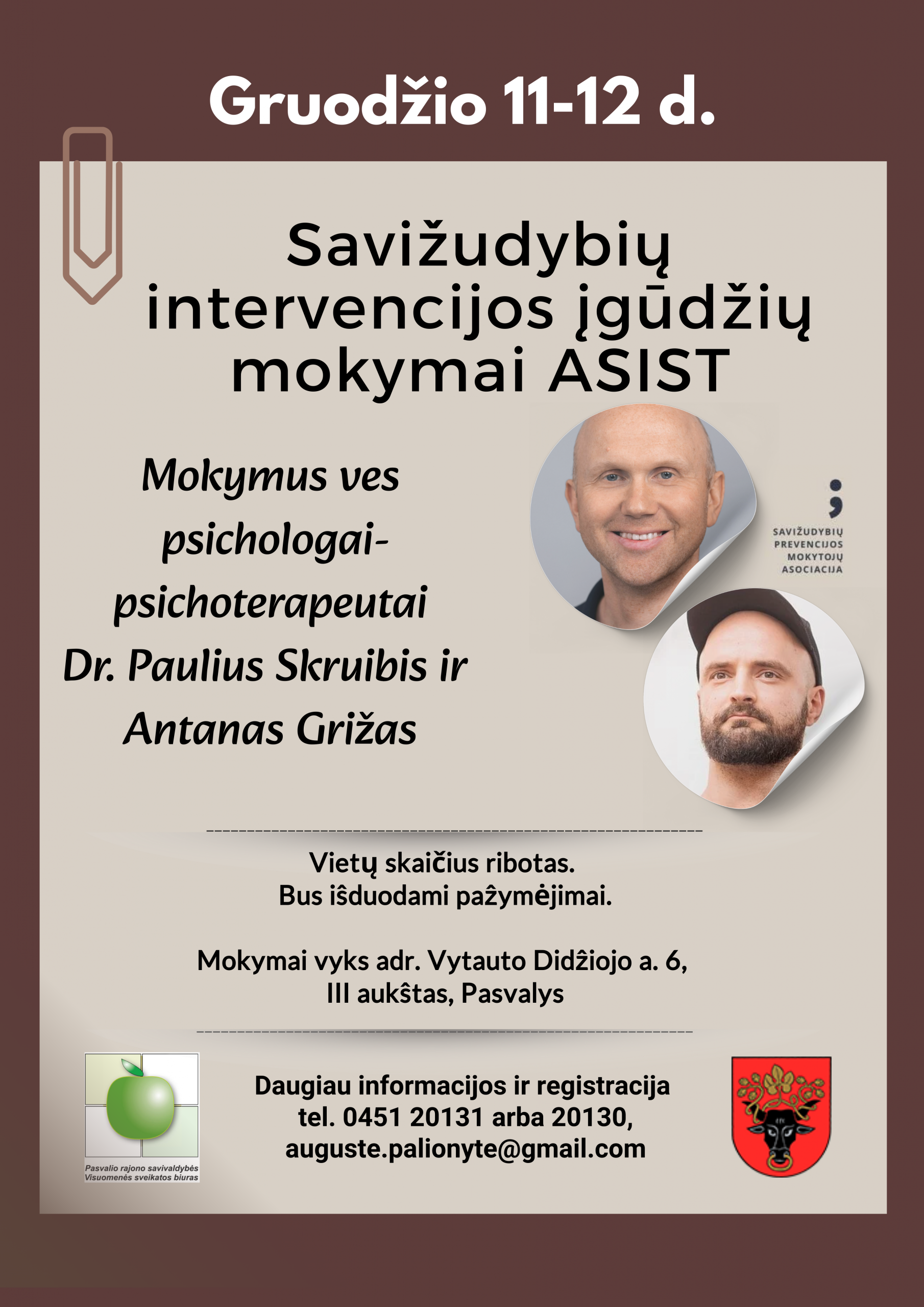 Gruodžio 11-12 dienomis Pasvalyje vyks savižudybių intervencijos įgūdžių mokymai ASIST, kuriuos ves geriausi šios srities specialistai: