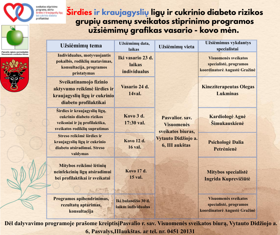 Ar žinojote, kad maži pokyčiai kasdienybėje gali užkirsti kelią rimtoms ligoms? Pasvalio r. sav. visuomenės sveikatos biuras kviečia dalyvauti Širdies ir kraujagyslių ligų bei cukrinio diabeto rizikos grupių asmenų sveikatos stiprinimo programoje.