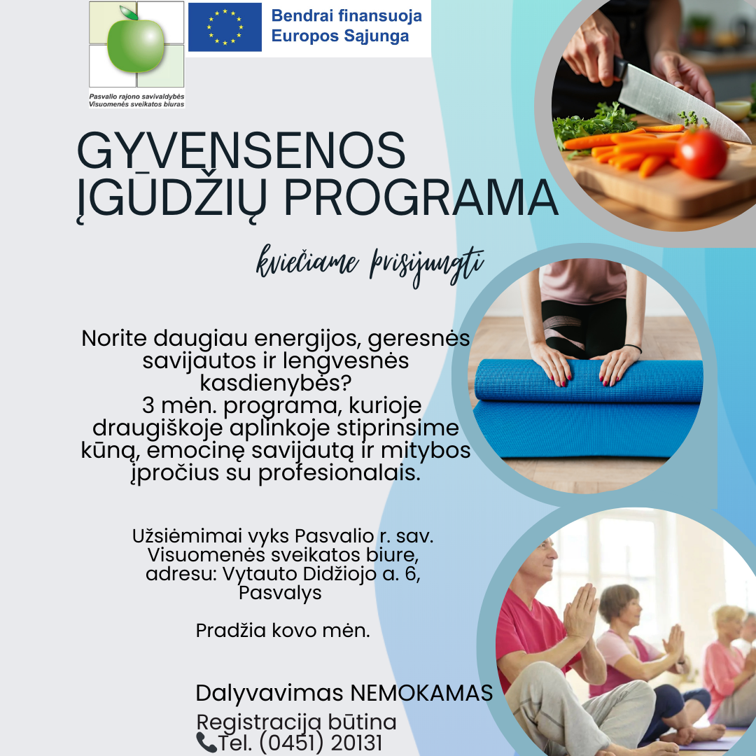 Programos metu stiprinsime sveikatą, gerinsime emocinę gerovę ir pasitikėjimą kasdieniu gyvenimu.