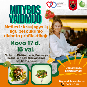 Kovo 17 d. Pasvalio r. sav. Visuomenės sveikatos biure svečiavosi mitybos specialistė Ingrida Kuprevičiūtė. Paskaitoje kalbėta apie cholesterolį, mitybą ir tai, kas iš tikrųjų vyksta mūsų organizme.