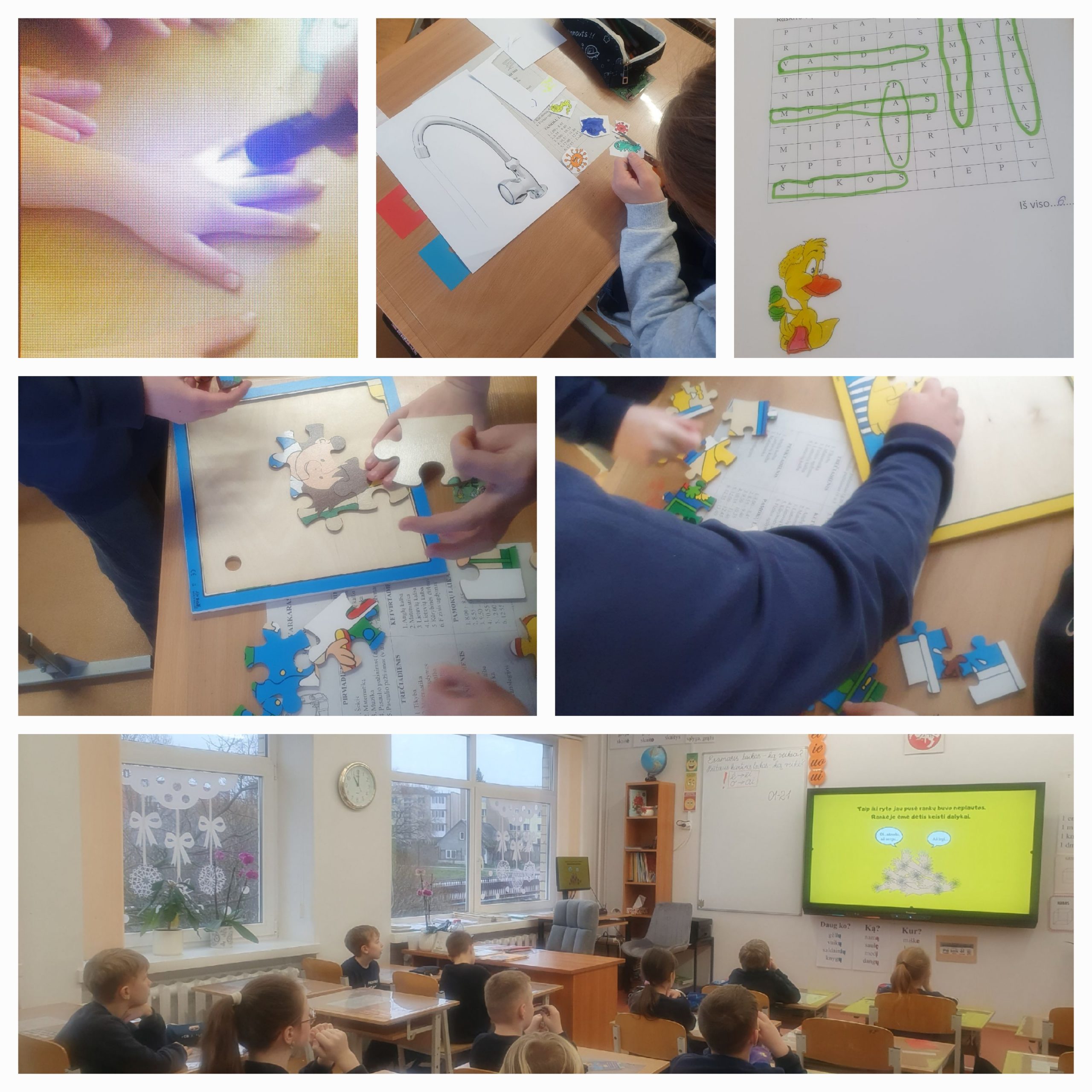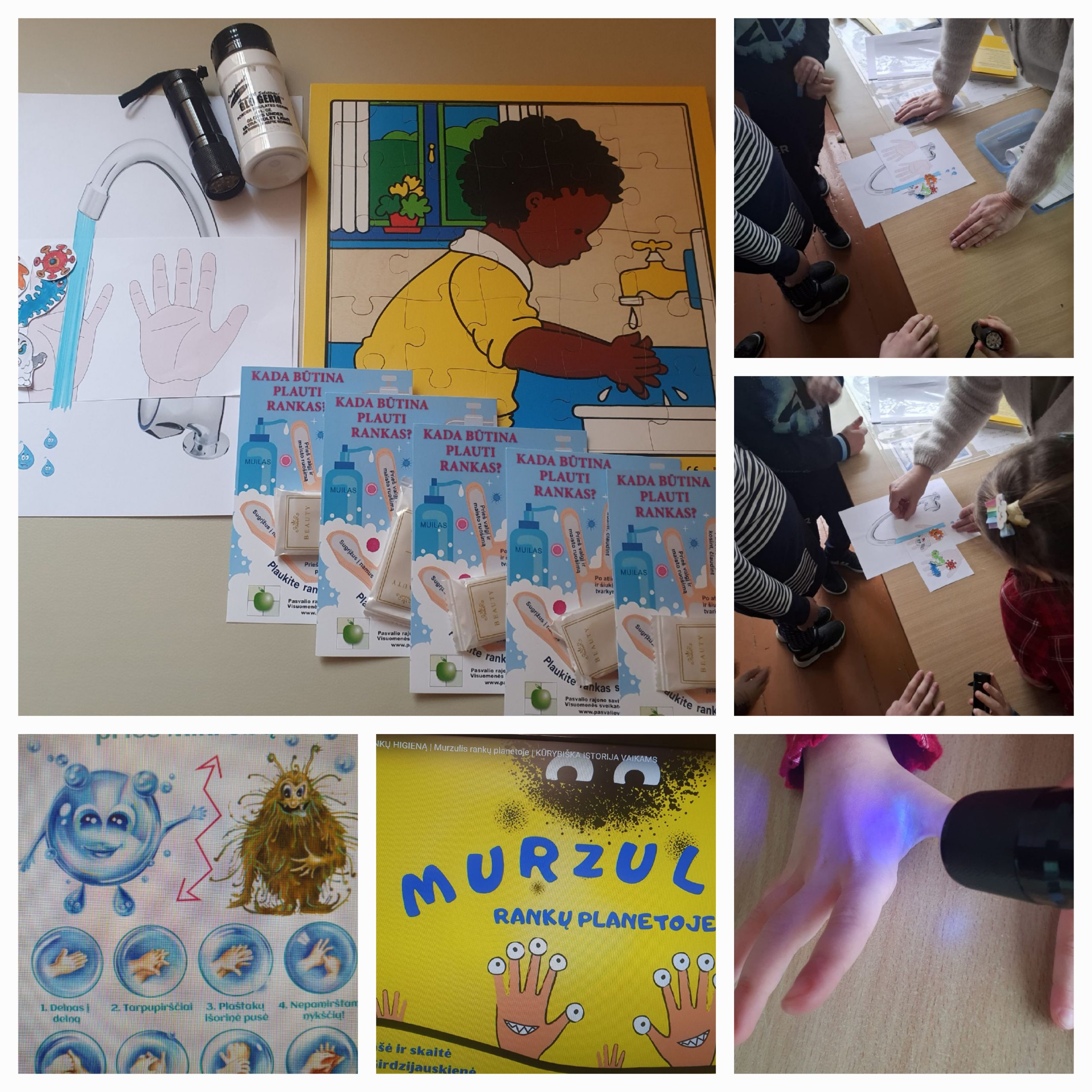 Pasvalio Lėvens pagrindinės mokyklos bei Pasvalio Svalios progimnazijos Krinčino skyriaus pradinukams sveikatos priežiūros specialistė N. Janeliūnienė kalbėjo apie rankų plovimo svarbą, vaikai pasikartojo, kada būtina plauti rankas ir kaip tai tinkamai daryti. Užsiėmimo metu buvo naudojami specialūs ,,Glo Germ“ milteliai ir UV žibintuvėlis. Ant durų rankenos užbėrus miltelių, švytinčių po žibintuvėliu ir ją palietus, mokiniai galėjo pamatyti švytinčius „mikrobus“ ant savo rankų, o paspaudę ranką draugams ant kurios buvo užberta miltelių ir pašvietus rankas žibintuvėliu paaiškėjo, kaip mikrobai nepastebimai perduodami draugams. Ant nuplautų rankų išvydę švytinčius mikrobus mokiniai suprato, kad rankas plauti reikia šiltu vandeniu su muilu, o ant paskubomis ir netaisyklingai nuplautų rankų lieka mikrobai, kurie gali sukelti ligas. Užsiėmimo metu vaikai žiūrėjo pasaką ,,Murzulis rankų planetoje“, dėliojo dėlionę, atliko kitas užduotėles.