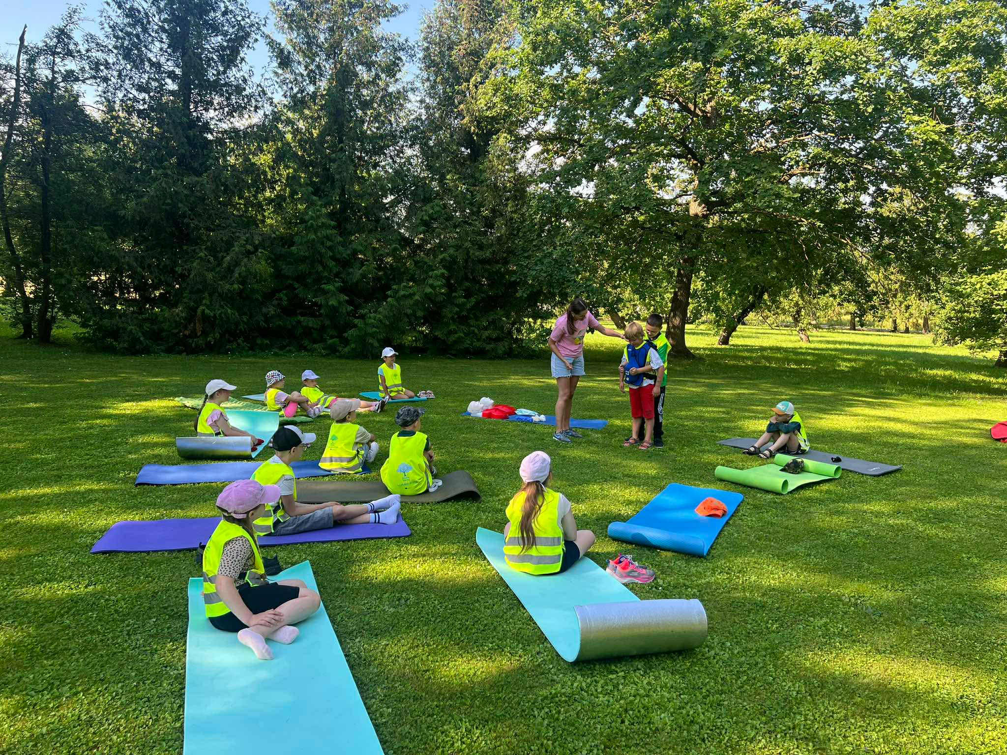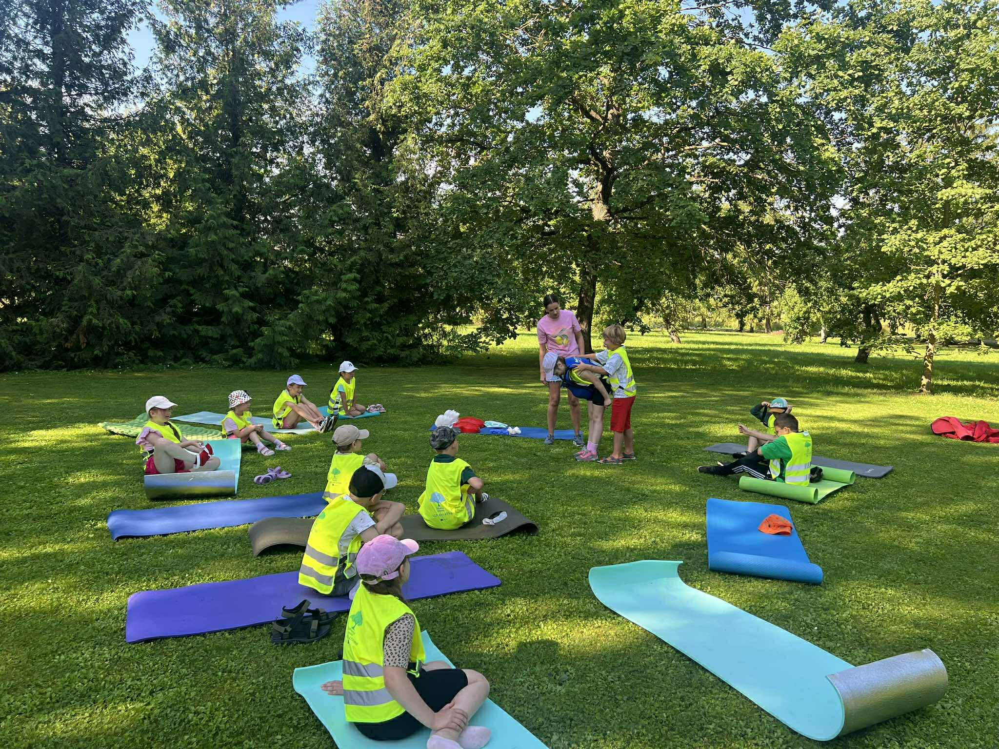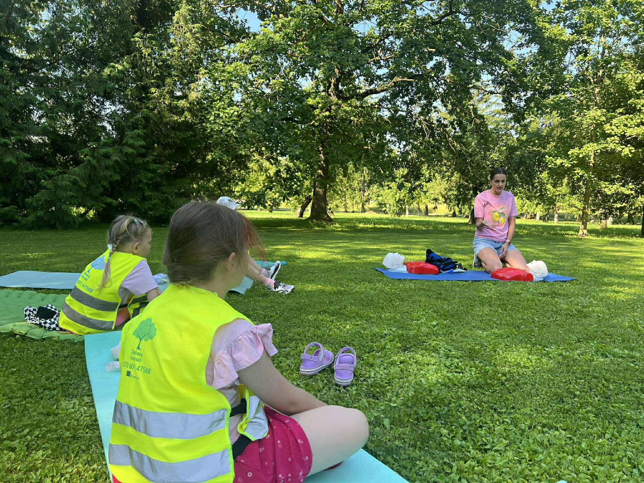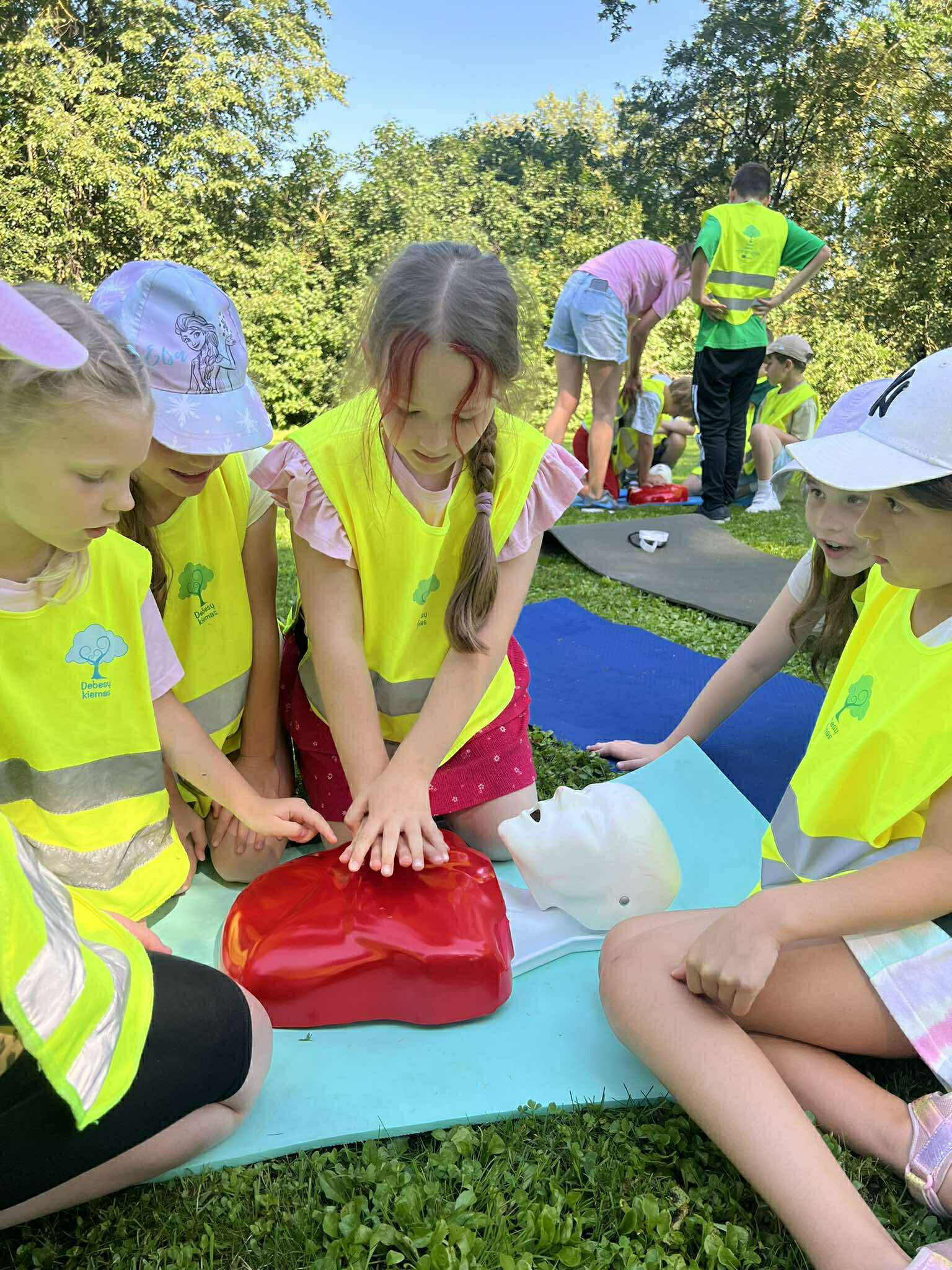Vasaros nuotykių metu ypač svarbu žinoti, kaip elgtis netikėtose situacijose. Todėl su vaikais aptarėme ir praktikavome esminius pirmosios pagalbos įgūdžius: