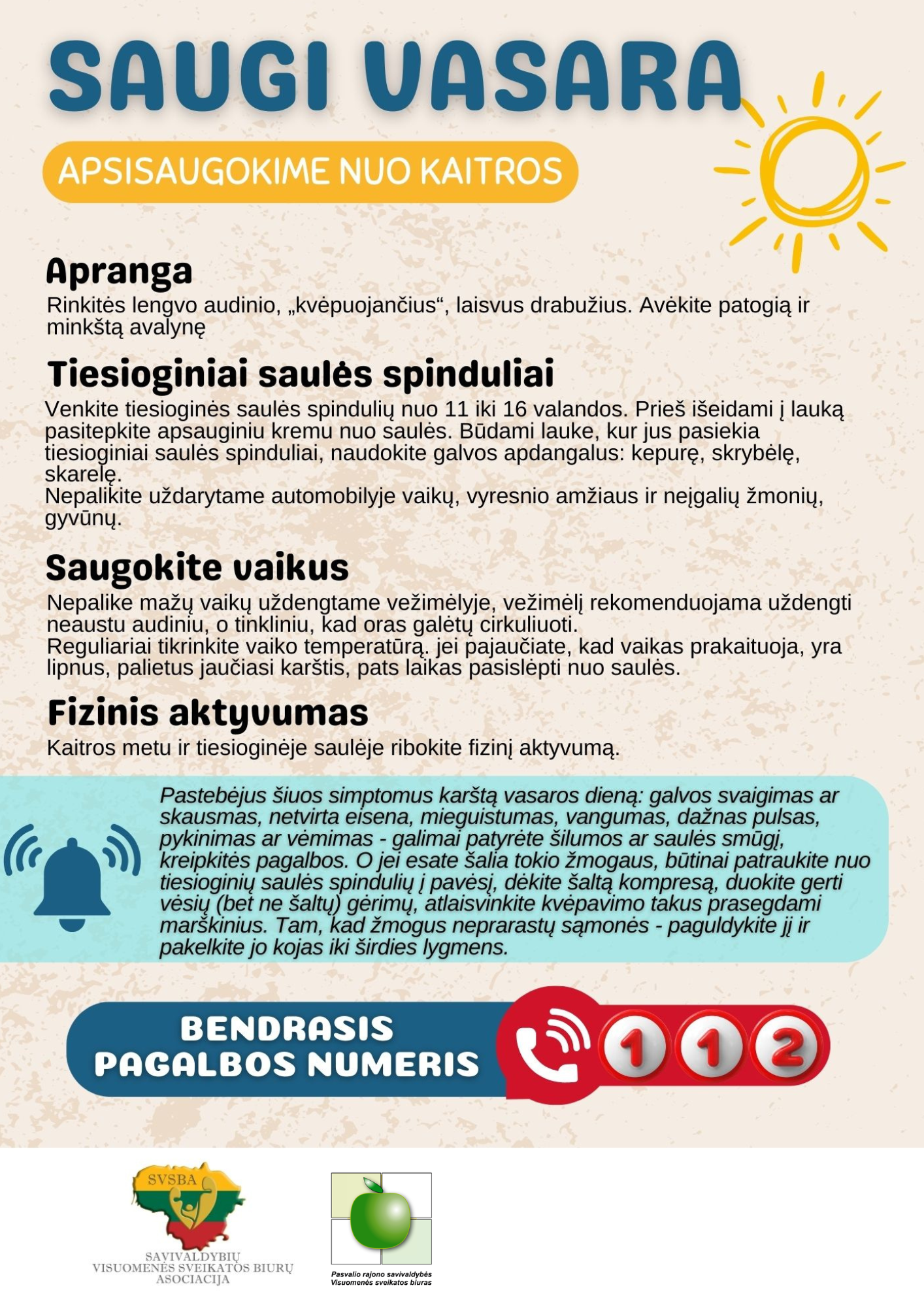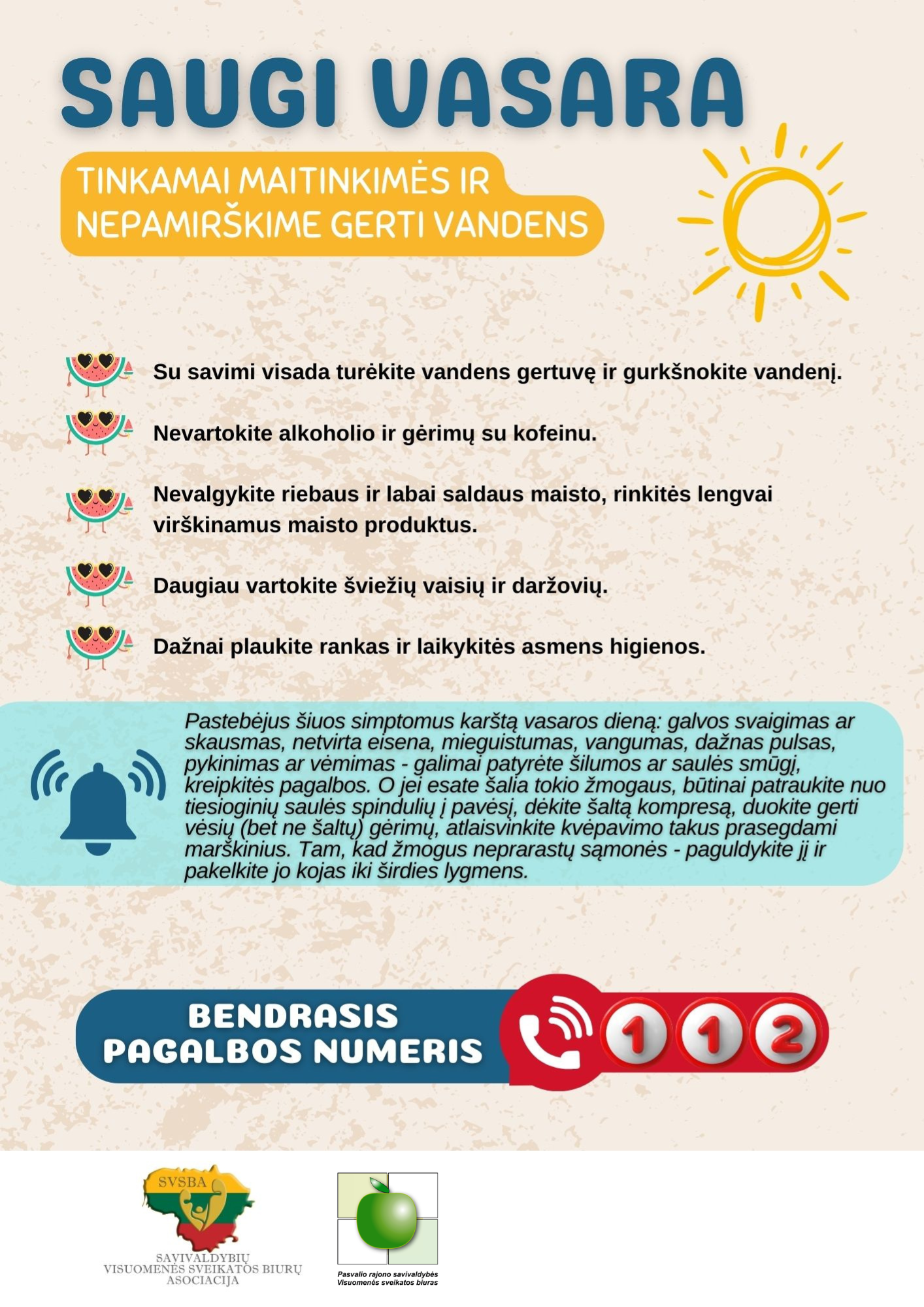Vasara – nuostabus metas stiprinti sveikatą, pailsėti, atgauti jėgas ir patirti daug džiugių nuotykių. Kad vasaros atostogos būtų smagios, įdomios ir saugios, kviečiame pakartoti saugaus elgesio taisykles.