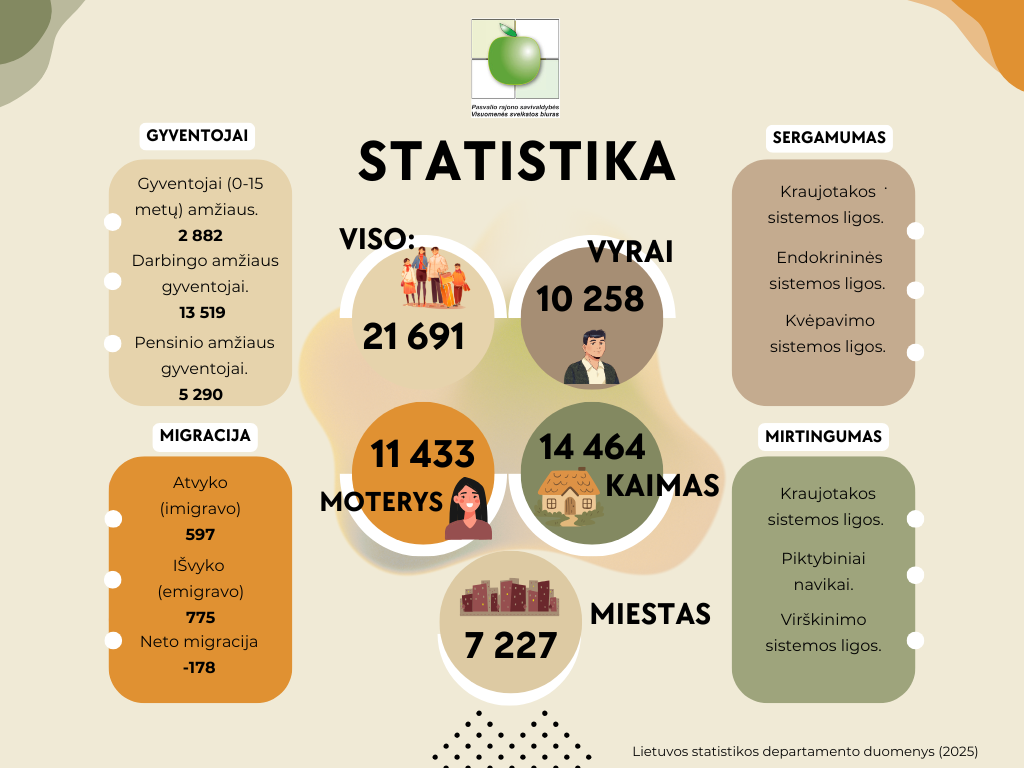 Migracijos duomenys rodo neigiamą balansą – 2025 m. iš rajono išvyko daugiau gyventojų nei atvyko. Dažniausios sergamumo priežastys – kraujotakos, endokrininės ir kvėpavimo sistemos ligos, o pagrindinės mirties priežastys – kraujotakos sistemos ligos bei piktybiniai navikai. Šie rodikliai pabrėžia prevencinių visuomenės sveikatos priemonių svarbą Pasvalio rajone.